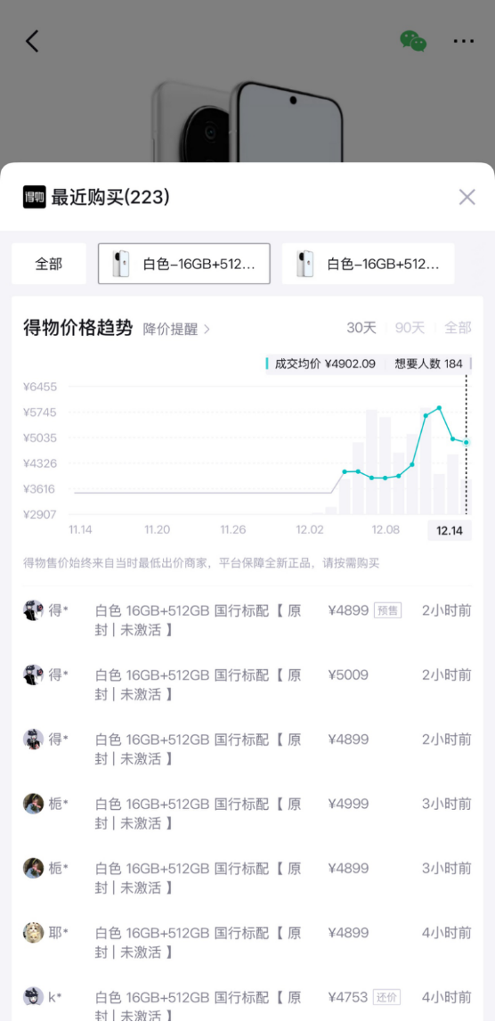 得物App数据显示,12月7日,豆包手机成交价曾短暂回落至3915元,较官方定价溢价416元,但随后迎来更猛烈的上涨势头。随着罗永浩、周鸿祎等知名创业者在社交媒体上对豆包手机的功能表示力挺,市场关注度急剧攀升。到12月11日,成交价达到6529元的峰值,相比发售价溢价3030元,溢价率高达0.7倍。