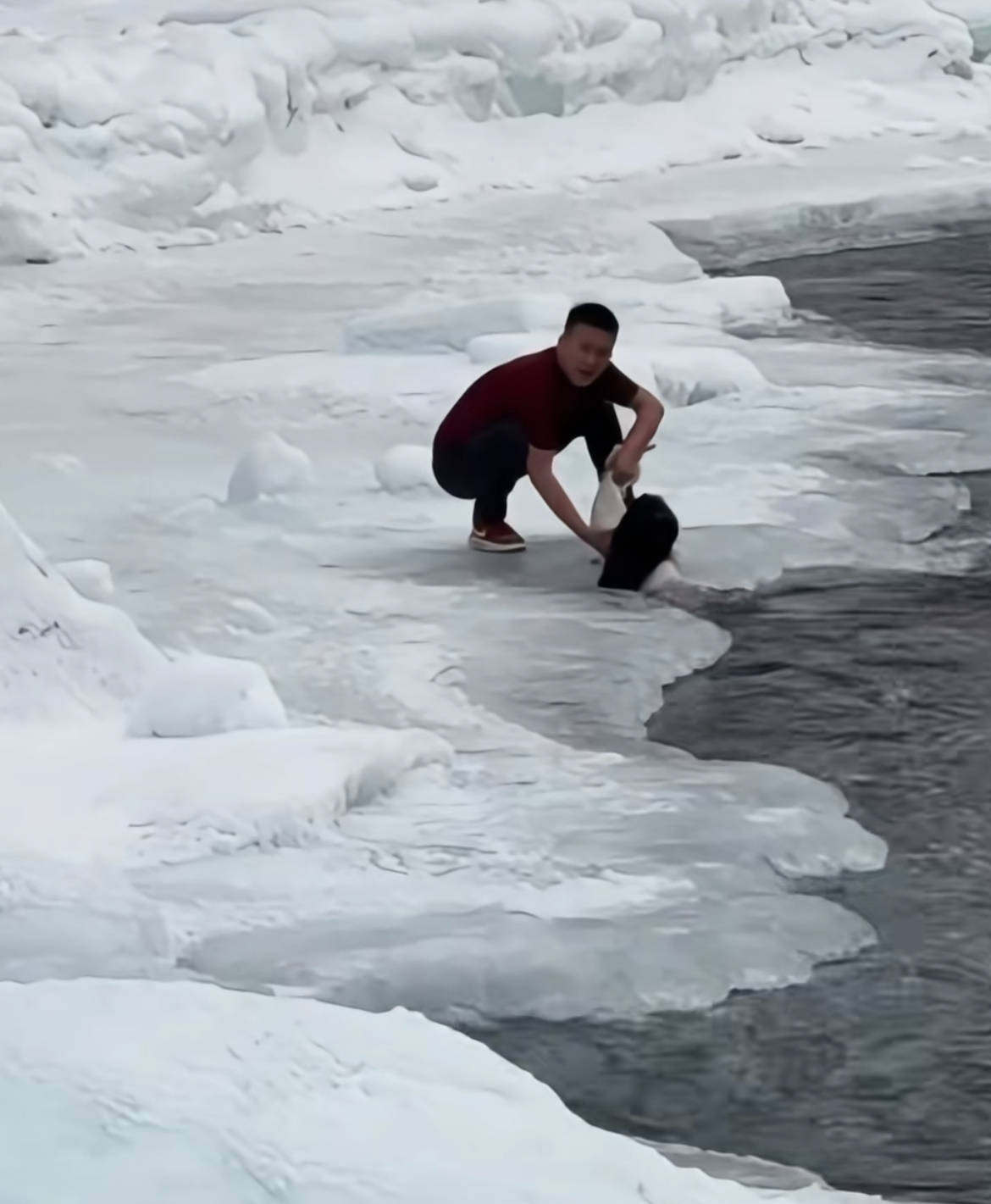 游客让对岸的母亲不要动,一名游客脱下外衣仅穿短袖,踩着冰层跳到对面,跑到落水者身边拽住,另外两人也跳到对岸,三人合力将其拖到岸上,随后护送到了对岸。