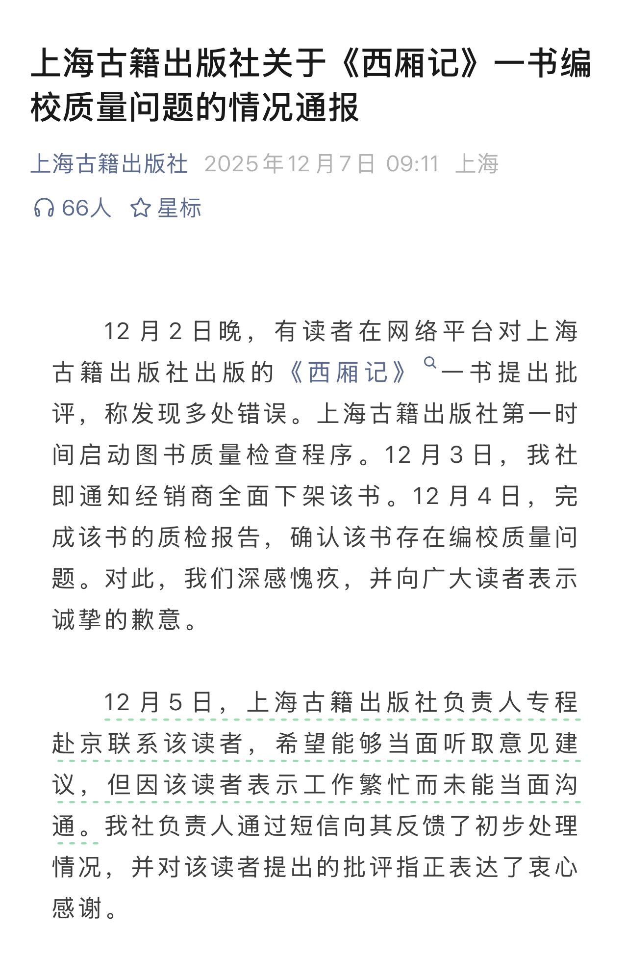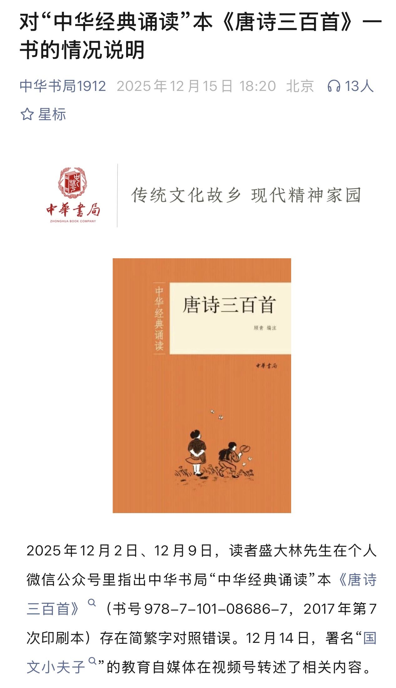 事件源于读者与自媒体的细致核查:12月2日,博主“一五老师”在社交平台指出,上海古籍出版社“国学典藏”系列《西厢记》存在包括人物断句、年号纪年在内的数百处错误;同日及12月9日,读者盛大林先生通过个人公众号指出中华书局“中华经典诵读”本《唐诗三百首》存在简繁字对照错误;12月5日,“一五老师”进一步指出中华书局《世说新语(中学生版)》也存在数十处字词错误。